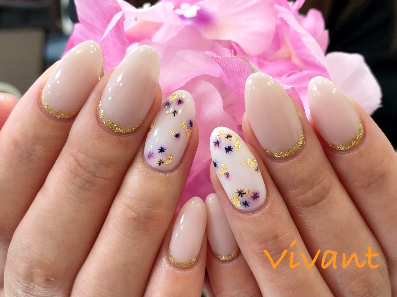 両薬指に押し花風の小花デザインにしています。